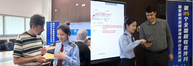 外籍教职工专场则由坪山区税务局征收管理科陈琳主讲。她聚焦非居民纳税人税收政策、境外所得申报指引、税收协定适用实务等专题,用英语进行深入浅出的讲解,重点解答了外籍人员常问的居民身份判定、境外收入计税、协定待遇享受等问题,帮助外籍教职工更好地理解并履行纳税义务。